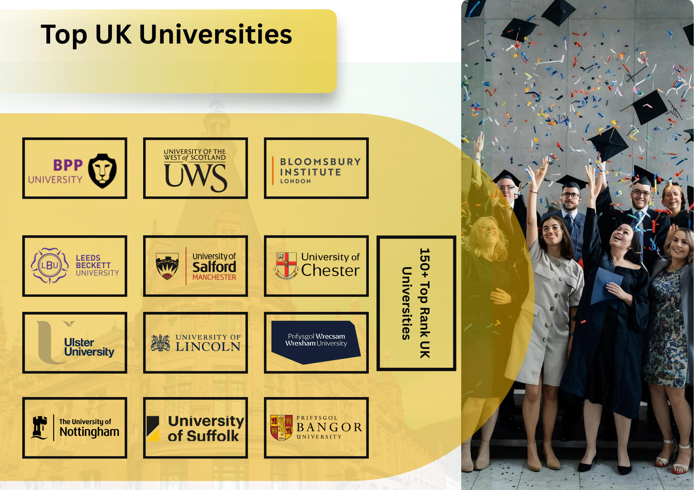 At Globaid Consultants, we proudly partner with more than 150+ top-ranked UK universities, offering students the chance to pursue world-class education across a wide range of fields.